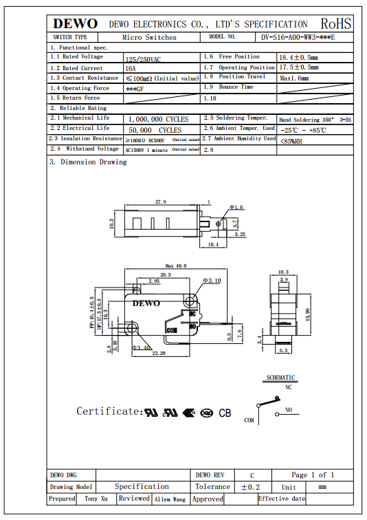 DV-16-A00-WW3-200E型微動開關